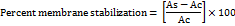 The reaction mixture (2 ml) consisting of 1 ml of sample/diclofenac sodium at different concentration and 1 ml of 10% RBCs suspension, parallel control was maintained under optimum conditions. The reaction mixture was incubated in water bath at 56 ˚C for 30 min. At the end of incubation, the tubes were cooled to room temperature. The reaction mixture was centrifuged at 2500 rpm for 5 min and the absorbance of the supernatant was measured at 560 nm. Percent membrane stabilization activity was calculated by using the following formula [29, 30].