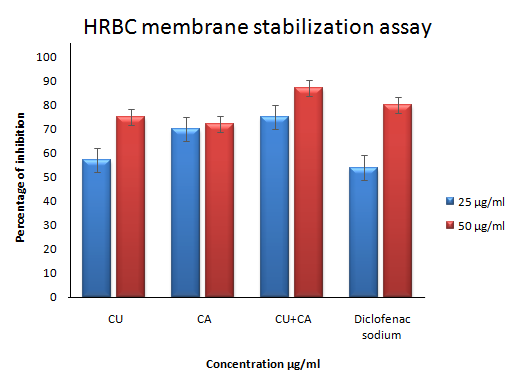 The inhibition of heat induced human red blood cell membrane lysis was taken as a measure of the mechanism of anti-inflammatory activity of individual and combined curcumin and capsaicin. 100% lysis was observed when the HRBC membrane was heat incubated; increasing temperature could cause decreased osmotic fragility [38] and change the intracellular metabolism and perturbation of membrane structure [39]. Nevertheless, the stability of heat incubated membrane integrity was consistently maintained by curcumin, capsaicin and their combination including standard diclofenac sodium as shown in fig. 1. Curcumin, capsaicin and their combination along with standard diclofenac sodium have shown dose-dependent protective activity against heat-induced lysis of HRBC membrane. Mechanism of curcumin has indicated that it is reported to be aggregating at relatively high concentration, within the lipid bilayer of the membrane [40]. While the capsaicin was able to enter and align with the phospholipid bilayer of the membrane. Membrane stabilization activity of curcumin and capsaicin at 50 µg/ml concentration was found to be 75.0±0.25 and 72±0.9 respectively. These results are in agreement with the previous reports of Arnab et al. [41], where they have shown concentration dependant protective activity of curcumin against 2, 2'-azobis (2-amidinopropane) hydrochloride-induced hemolysis of HRBCs. Similarly, capsaicin has also shown a dose-dependent protective effect against the osmotic fragility of human erythrocytes, at 10-4 and 10-5 M [2]. However, combined curcumin and capsaicin have shown (25 μg/ml + 25 μg/ml) 87.0±0.64 % activity, which is more significant than individual molecules and standard diclofenac sodium (80.0±0.31 at 50 µg/ml). Increased membrane stabilization effect of combined curcumin and capsaicin may be due to the facilitating effect of capsaicin in overcoming the mere aggregation of curcumin on the membrane surface by perturbing the packing of lipids and affecting the thermo tropic properties inside the cell.
