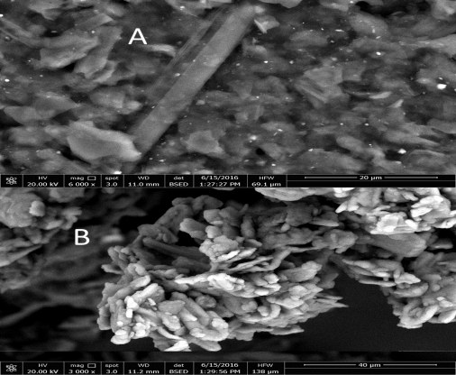 The SEM images of both CPE and MWCNT modified electrode are shown in fig. 1. The response of an electrochemical sensor was related to its physical morphology. Significant differences are observed in the surface structure of the two electrodes. The SEM image of the bare CPE is irregularly shaped graphite flakes and separated layers. While, the SEM image of MWCNT modified electrode shows flowery shaped SEM with a physical appearance and surface characteristics of, most of the particles homogeneously dispersed on the electrode's surface. This flowery like structure; displays a high surface area as shown in fig. 1.