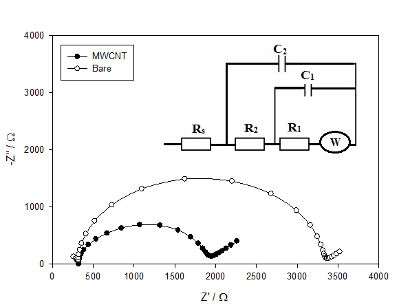 Fig. 2: Nyquist plots for both bare and MWCNT electrodes. Inset: Two time constant equivalent circuit model including Warburg diffusion impedance