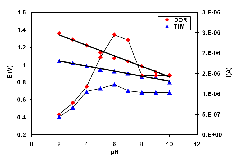 The result shows, that the slopes of DOR and TIM were-0.0603 and-0.028V, respectively, [37] indicated that the system obeys Nernest equation. These results revealed that an equal number of participated protons and transferred electrons are involved in the oxidation case of DOR but not the same number in TIM. The proposed mechanism was a loss of lone pair of electrons for amine group with losing of two protons in the oxidation of DOR and loss of one electron in the case of TIM as depicted in scheme 2.