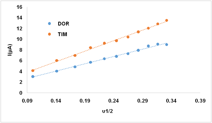 The oxidation peak potential shifts with increasing scan rates toward a more positive potential, indicating that oxidation process is irreversible. Scan rates were also studied to evaluate whether the process on MWCNT electrode was underneath diffusion or adsorption controlled. With increasing scan rate, the oxidation peak current of DOR and TIM increased, the relation of the square root of scan rate with the peak height of current exhibit a linear relationship in the range of 10-110 mV/s fig. 4 which represents a typical diffusion controlled process and equation can be expressed by