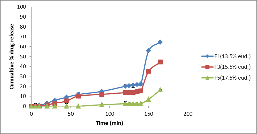 Fig. 1: Effect of eudragit L-100 concentration on the release of naproxen from monolayer enteric-coated oroslippery tablets (F1, F3, F5) in (0.1N HCl) for 2 h followed by their addition to (phosphate buffer pH 6.8) for 45 min, where all core tablets containing 2% CCS as super disintegrant (Error bars indicate mean±SD, n=3)