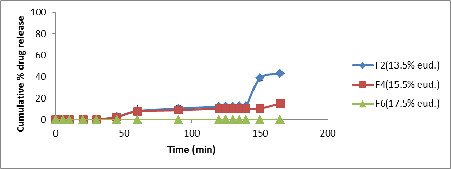Fig. 2: Effect of eudragit L-100 concentration on the release of naproxen from double layer enteric-coated oroslippery tablets (F2, F4, F6) in (0.1N HCl) for 2 h followed by their addition to (phosphate buffer pH 6.8) for 45 min, where all core tablets containing 2% CCS as super disintegrant (Error bars indicate mean±SD, n=3)