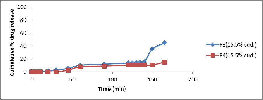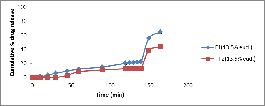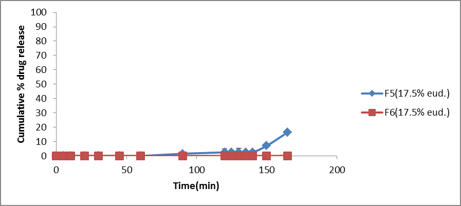 Formulas F1, F3, F5 (mono-coated) and formulas F2, F4, F6 (double-coated) were prepared using different concentration of eud. (13.5%, 15.5% and 17.5% w/w) respectively to demonstrate its effect on the release of naproxen from the prepared tablets.