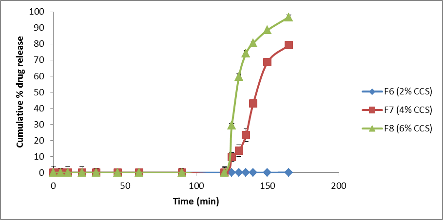 The effect of CCS concentration on drug release from the prepared tablets was studied using (F6-F8) containing 8, 16 and 24 mg CCS respectively.