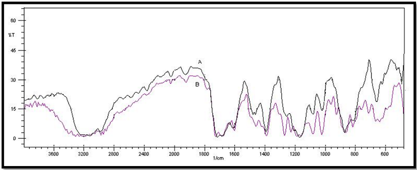 Fig. 7: FTIR spectrum of (A) naproxen and (B) F8