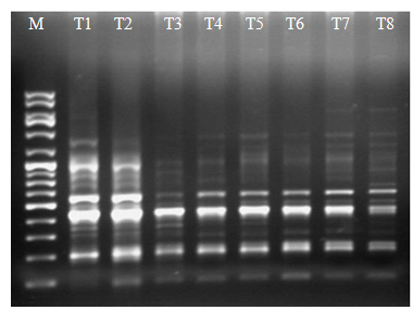 Data analysis was done using Alpha Imager EC software. For each accession, each fragment/band that was amplified was treated as aunit character. Amplified agarose gel pictures were compared with each other, by considering the presence of bands represented by (1) and absence represented by (0). The molecular size of the amplification product was calculated with 100bp plus molecular size weight marker (Bangalore Geneiand Bio-Basic.Inc.).All the amplified profiles were analyzed together to form a binary data matrix. The commercial software package NTSYS-PCversion 2.0 [14]was used to develop similarity matrix. These data were used to construct dendrogram for cluster analysis based on unweighted pair group method with arithmatic means (UPGMA).