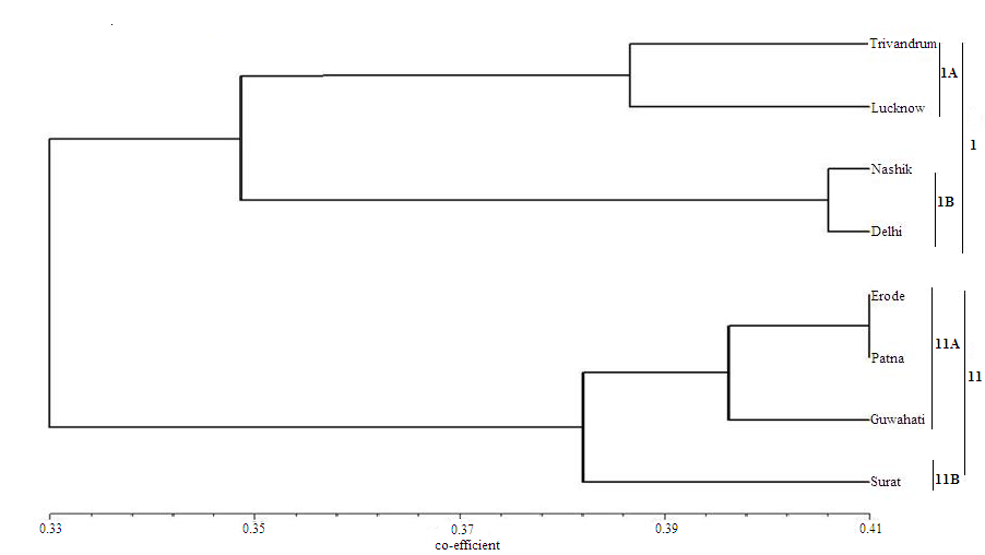 RAPD marker was used to carried out genetic diversity studies in C. longa collected from different geographical regions of India. DNA was isolated by modified CTAB method. DNA extraction of turmeric proved difficult due to the presence of secondary metabolites. A modified CTAB method was proved to be fruitful. The modified method included higher incubation temperature (65°C). Random amplified polymorphic DNA and related techniques require less DNA, but purity is necessary to ensure repeatability and confidence [11-12]. The purity of DNA determined from the ratio of optical density of 260/280 ratio which ranged from 1.80 to 1.92 for the samples indicates the purity of DNA in all samples. Based on the dendrogram (fig.2), the 08 accessions were grouped into two main clusters (1 and11). Upper cluster divided into two main subcluster 1A and 11B. Trivandrum and Lucknow shows similarity at 39%. In cluster 1B, Nashik and Delhi shows similarity at 41%. In lower cluster 11B, the similarity between Erode and Patna is found to be 41%. Accession Surat shows somewhat divergence from themain cluster. The high difference in gene diversity among accessions reveals the presence of strong genetic structure between them and thus significant differences exist in the genotypic diversity among themselves. Therefore from clustering results of different accessions suggested that C. longa undergoes genetic variation.