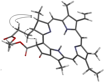 First, confirmation of the almost planar structure of porphyrin moiety was explained. The NOESY correlation observed between H-18 (δH 4.46) and H-172 (δH 2.50 and 2.22) was inferred that H-18 was the same face as H-172. Another key NOESY signal between H-17 (δH 4.20) and H-132 (δH 6.30) was observed, which proved that two methyl esters were the same β-orientation. Moreover, the configuration at C-132 was determined by Inhoffen method [30, 31]. The method described the deshielding effect of a functional group side chain at C-132 against H-17 leading to the determination of its configuration R or S. If the 132-CO2Me is located on the same side of the molecular plane as 17-H, it gives the deshilded effect and has the R configuration. On the other hand, when the 132-CO2Me has the opposite configuration S, the 17-H signal is little affected (Δδ 0.1) by the presence of the functional group.
