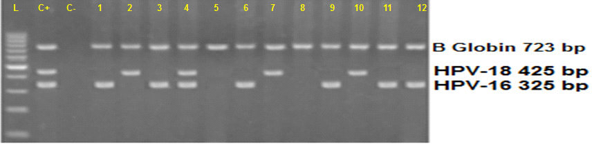 Fig. 1: Gel electrophoresis of HPV16/18 PCR products of 12 samples from patients group. L: ladder, C+: positive control, C-: negative control