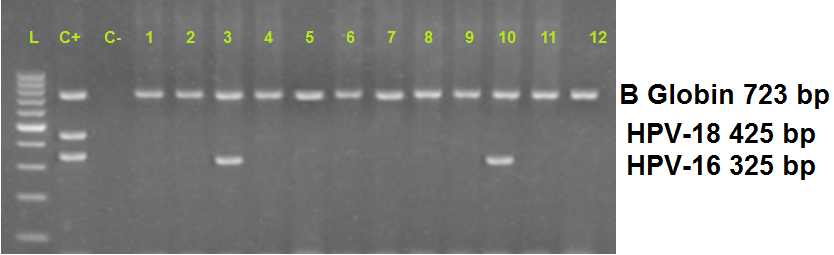 Fig. 2: Gel electrophoresis of HPV16/18 PCR products of 12 samples from controls group. L: ladder, C+: positive control, C-: negative control