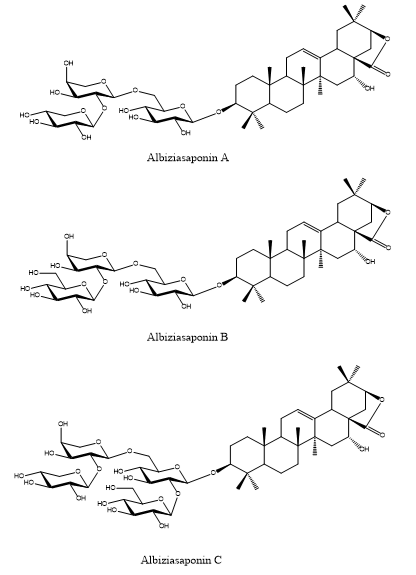 Extracts of the bark and stems from A. julibrissin showed some triterpenoid saponins that is acylated with acid groups linked and aglycon of monoterpenes. Some of these saponins exhibited remarkable inhibitory activity against cancer cell lines in vitro (Fig. 2) [13].