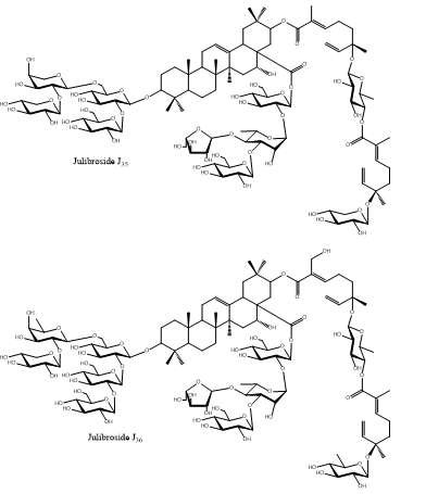 Fig. 2: Structure of three complex triterpenoid saponins of Albizia julibrissin, Julibroside J32, Julibroside J35 and Julibroside J36