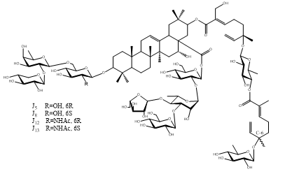 Fig. 3: Structure of four saponins of A. Julibrissin, J5, J6, J12 and J13.
