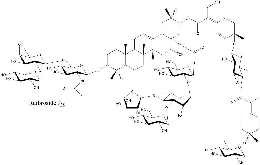 A potent antitumor activity was attributed to saponin isolated from A. julibrissin, J28 (Fig. 4). Have Zhang et al, 2006, isolated and elucidated three complex triterpenoid saponins A. julibrissin, J29, J30 and J31 (Fig. 5). All saponins exhibited antitumor activity against human tumor cells line [15].