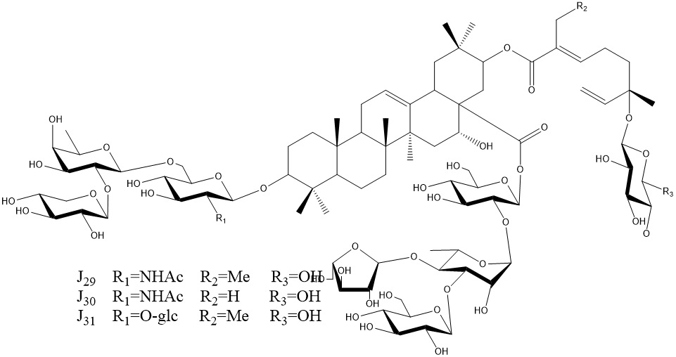 Fig. 5: Structure of three saponins isolated from A. julibrissin, J29, J30 and J31