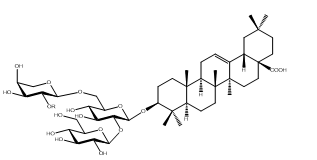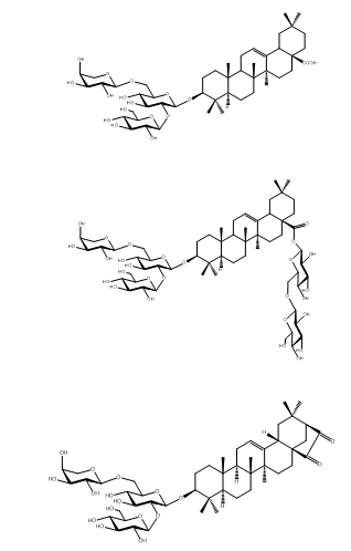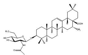 Most aglycone is the type of oleanolic acid substitution oligosaccharides in positions C-3, C-21 and C-28 to form tritepenoid saponins. In the sugar chain at C-28, all saponins are replaced with Glc-(1 → 3) - [Ara-(1 → 4)]-Rha-(1 → 2)-Glc. The sugar chain at C-3, on the other hand, has six options Xyl-Ara/Fuc-GlcXyl-Ara/Fuc-Glc (2-NHAc) and Xyl-Ara/Fuc- (Glc) Glc, as for the sugar chain at C-21, there are only two types of sugars (Qui or Xyl) [12].
