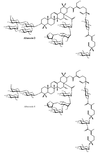 Two complex triterpenoid saponins of Albizia chinensis Mer. Were isolated from the butanolic extract between peels. The saponins, called Albizosides D and E (Fig. 7) showed cytotoxic activity against human tumor cells line [17].