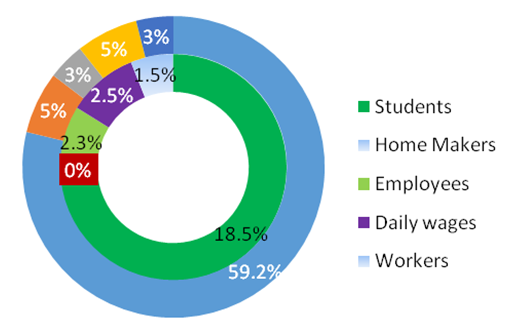 Fig. 1: Among 1000 population, 752 (75.2%) were females and 248 (24.8%) were males. Out of 752 females, 592 (59.2%) members were students, 50 (5%) were homemakers, 30 (3%) were employees, 50 (5%) were daily wages, 30 (3%) were workers. Out of 248 males, 185 (18.5%) were students, 23 (2.3%) were employees, 25 (2.5%) were daily wages, 15 (1.5%) were workers. Among all the population majority of the respondents were students
