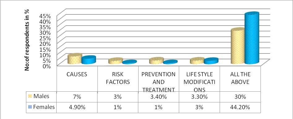 Fig. 8: Among all the respondents 493 (49.3%) females and 400 (40%) males, 1% had agreed that safe sexual practice, 1% had agreed that physical activity and 4% had agreed that diet were the lifestyle modifications to be followed