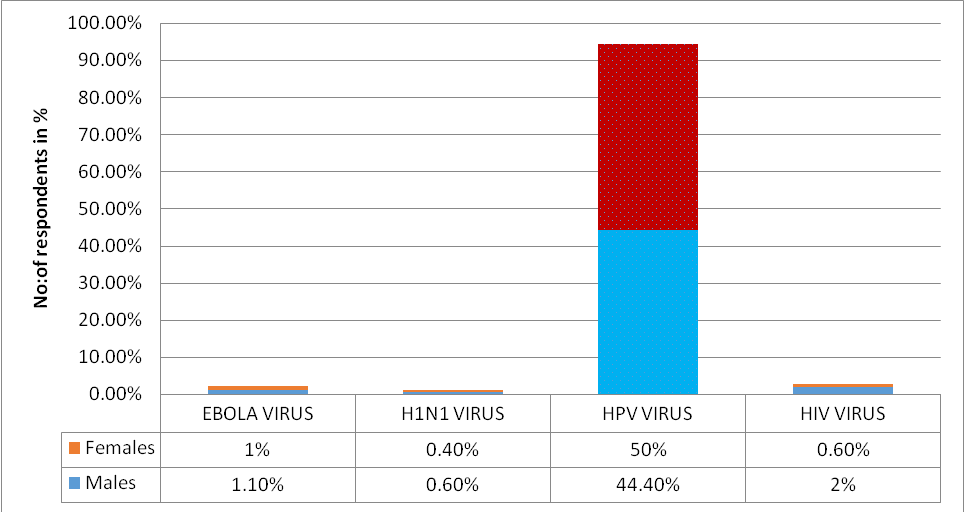 Regarding the level of awareness, out of 1000 members, 405 members (40.5%) belonging to the science field have said that they heard about cervical cancer and 595 members (59.5%) answered that they don’t know about cervical cancer. Most the population i.e. 595 members (59.5%) belongs to the non-science background answered that they don’t know about the causative organism whereas, 405 members (40.5%) belongs to the science background answered that they know about the causative organism of cervical cancer. Out of 1000, 595 members (59.5%) are not aware of the HPV vaccine whereas, 405 members (40.5%) were aware of HPV vaccine (table 3 and 5) [14].
