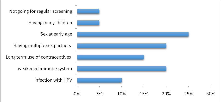 Regarding the knowledge of risk factors for cervical cancer, the maximum number of population (30%) has answered that sex at an early age is the major risk factor for cervical cancer. 20% of the population had answered that weakened immune system is the risk factor. The population of 20% had answered that it is due to multiple sexual partners. The 15% of population believed that long-term use of oral contraceptives is the major risk factor whereas, 10% had answered that it is due to infection with HPV and remaining 5% of the population had answered that the major risk factor is having many children and not going for regular screening (fig. 5).