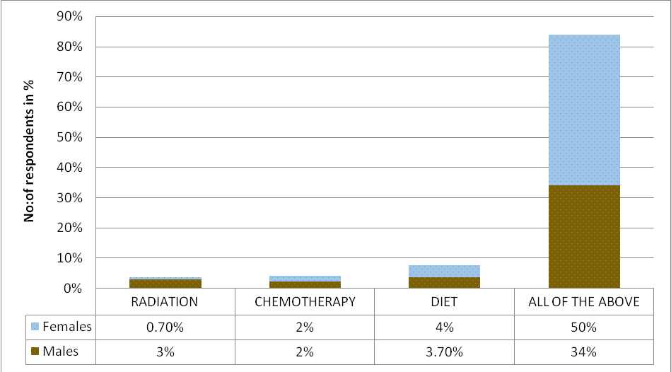 Among all the respondents 500 (50%) females and 340 (34%) males had chosen radiation, chemotherapy, and dietary changes were the treatment options for cervical cancer.