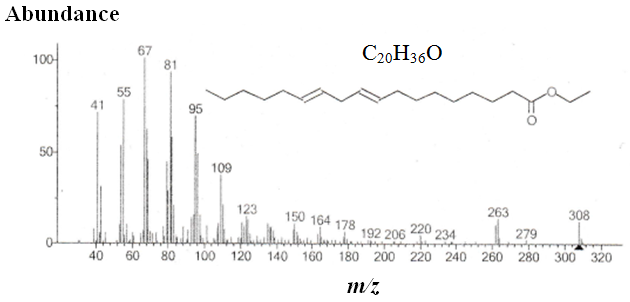 In fig. 1, the peak at a retention time of 23.576 min has a mass spectrum data consistent with hexadecanoic acid, ethyl ester. The mass spectrum exhibited a parent ion at m/z 284 consistent with the molecular formula C8H36O2. In addition, in fig. 2, the peak at a retention time of 30.438 min has a mass spectrum data consistent with 9,12-octadecadienoic acid, ethyl ester. The mass spectrum exhibited a parent ion at m/z 308 consistent with the molecular formula C20H36O2.