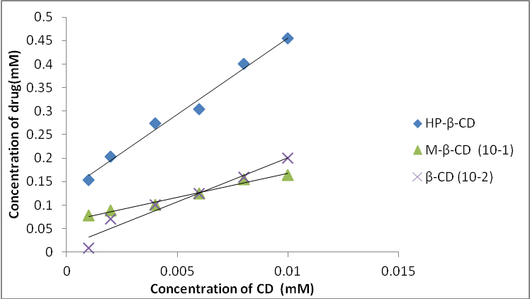 The elucidation of phase solubility profile is the fundamental technique to explain the host-guest interaction because it gives not only the solubilizing ability of the host molecules but also the stochiometric ratio of the components of the complex in which they are associated [30]. The phase solubility studies of TEL were carried out with β-CD, HP-β-CD and M-β-CD in triple distilled water at 37 °C for 24 h and their respective phase solubility profiles for the complex formation are shown in fig. 1. It was observed from the phase solubility diagram results that the type of CD used influences greatly the TEL solubility.
