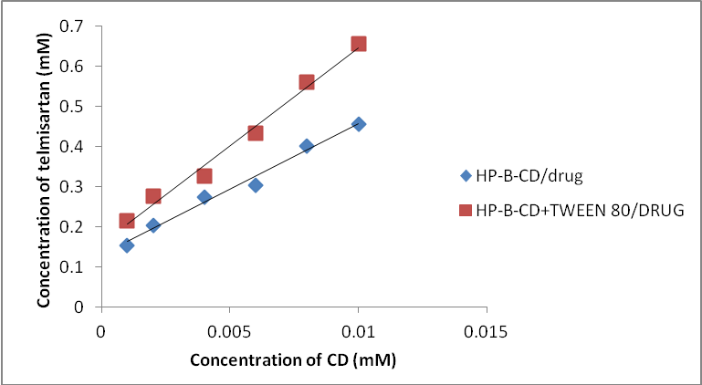 Fig. 3: Phase solubility diagram of telmisartan with hydroxyl-propyl-β-cyclodextrin in the absence and presence of tween 80