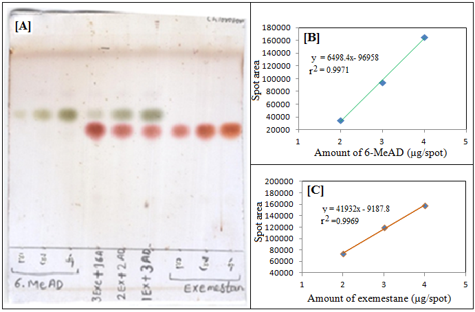 Fig. 1: TLC chromatogram of standard concentrations (2, 3 and 4 µg) of 6-MeAD (left), exemestane (right) and mixtures (1+3, 2+2 and 3+1 ug) of these compounds respectively (center) [A] and response curves between spot area and concentration of 6-MeAD [B] and exemestane [C] obtained by image analysis software