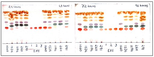 After confirmation of essential criteria for quantification including selectivity, linearity, limit of detection and repeatability, the validity of image analysis method was tested using some bacterial strains reported in the literature to dehydrogenate various steroidal precursors to their C-1(2)-dehydrogenated products. Exemestane accumulated in the fermentation broth during the bioconversion of 6-MeAD were estimated by HPLC as well as image analysis after separation of these compounds on TLC plate (fig. 2). It was observed that out of five strains selected for the study, three organisms accumulated exemestane at 48 h incubation period. At 48 h, Arthrobacter simplex IAM 1660, Nocardia sp. MTCC 1534 and Rhodococcus rhodochorus MTCC 291 yielded about 73.4, 55.9 and 16.4 mole percentage bioconversions respectively. Comamonas testosteroni NRRL 2611 failed to accumulate exemestane in the incubation medium throughout the course of fermentation. Except Comamonas testosteroni NRRL 2611, the bioconversion by other bacterial strains increased at 96 h incubation period and a maximum mol % bioconversion was recorded in case of Rhodococcus rhodochorus MTCC 291. The percentage error between all estimations by image analysis and HPLC of 6-MeAD and exemestane was found to range between an acceptable experimental error of (-) 5.38 to (+) 4.71 (table 2).