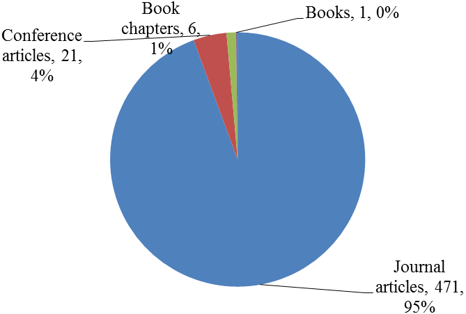 A total of 499 publications including journal articles (94.4%) were retrieved covering the period between 1981 and April 2016 (fig. 1). This number of publications is based on the “normal counting method” whereby each author receives a full count for joint publications. According to Egghe, three methods of counting the number of publications are the total or normal counting method that involves assigning every author a weight for each of the publications; the straight counting in which only the first author is assigned a weight for each publication; and the fractional counting in which every author is assigned a weight 1/n in an n-authored paper [34]. Journal articles comprise the great majority of publications simply because peer reviewed journals are the major communication channels for research findings. These 499 publications which were visible online were either published in online journals (e-journals) or they were retrieved as bibliographic information of print publications cited by online publications. Of the 33 scholars, eight of them had either not published a single scholarly article or they had not published in online journals, books or conference proceedings. The average number of publications per year was 14 with the year 2013 being the most (61; 12.2%) productive (table 1). It should be noted that these publication data were extracted in April 2016; hence it is likely that the total publication productivity for the year 2016 was incomplete.