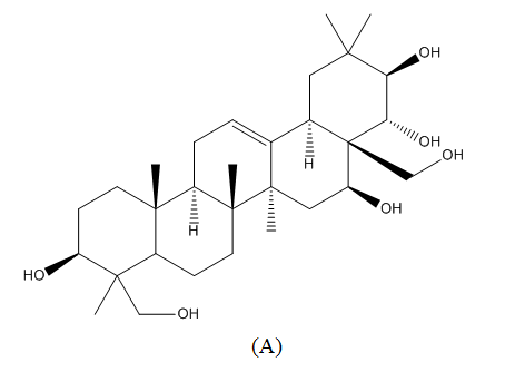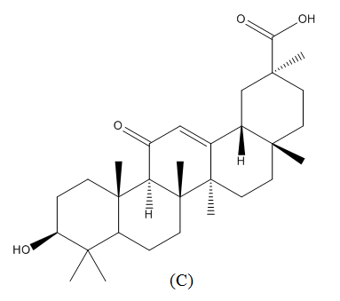 Fig. 1: Chemical structures of (A) Gymnemagenin, (B) Gallic acid, and (C) 18β-Glycyrrhetinic acid
