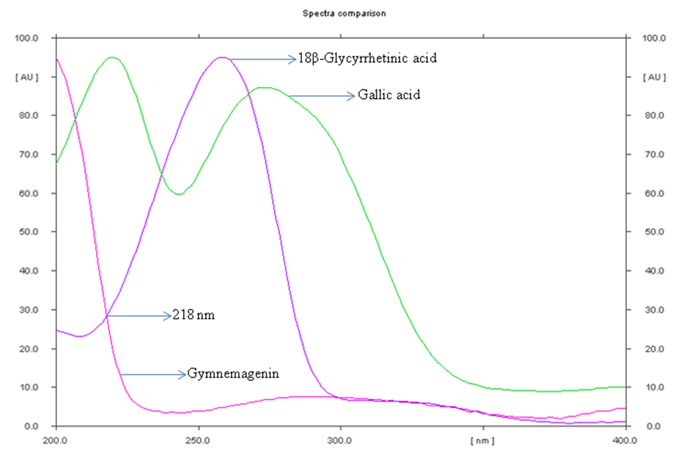 To obtain UV spectrum, 5 μL solution (in triplicate) of all phytoconstituents were applied on HPTLC plate and subjected to densitometric scanning over a range of 200-400 nm. Densitometric spectra obtained were overlain which showed that all phytoconstituents have reasonable absorption at 218 nm. Hence it was selected as the detection wavelength (Figure 2) for analysis.