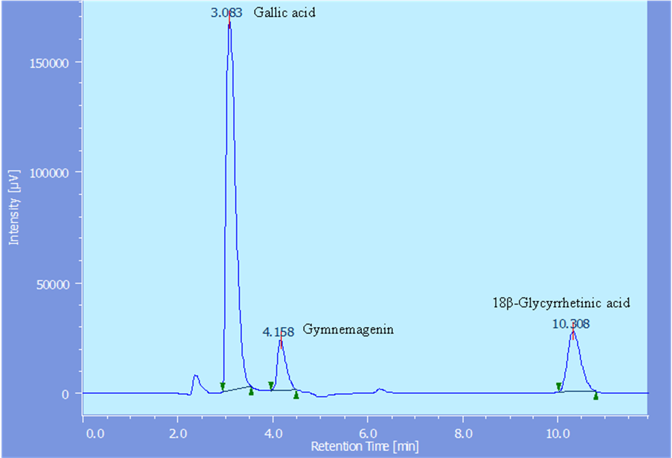 During the optimization of the proposed RP-HPLC method, different HPLC columns, mobile phases of various compositions of acetonitrile, water, methanol, potassium dihydrogen phosphate, sodium dihydrogen phosphate buffer with different molarities and different pH were tried. Finally the mobile phase consisting of methanol: water (88: 12, v/v), pH 3.1, adjusted with orthophosphoric acid was selected as it gave well resolved peaks. The column used was Thermo Synchronis C18 analytical column (250×4.6 mm i. d., 5 μm) and a flow rate of 0.8 mL min-1. The optimum wavelength for detection and quantitation used was 218 nm. Average retention time for gallic acid, gymnemagenin, and 18β-glycyrrhetinic acid were found to be 3.08, 4.15 and 10.30 min, respectively (Figure 3).