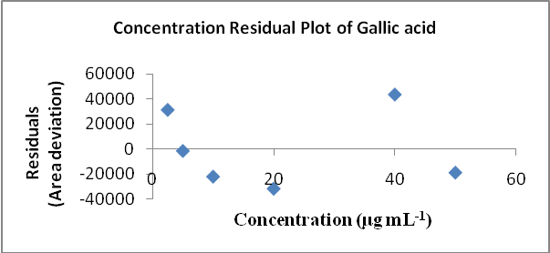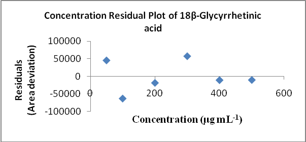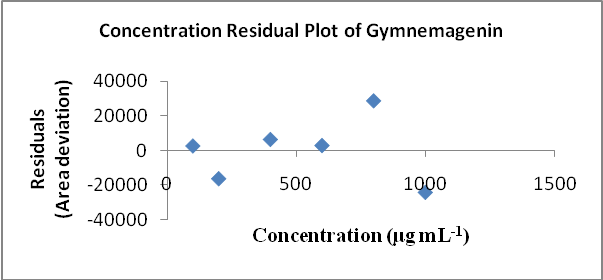 Linearity was performed by injecting stock solutions in the range of 100-1000 μg mL-1 for gymnemagenin, 2.5-50 μg mL-1 for gallic acid and 50-500 μg mL-1 for 18β-glycyrrhetinic acid. Peak areas obtained were processed and calibration curves were generated by Microsoft Excel software. To prove linearity, residual analysis was also performed along with correlation coefficient. Each standard solution of six different concentrations was injected in six replicates and chromatographed using the chromatographic conditions mentioned above.