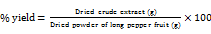 Dried fruits of P. retrofractum, obtained from Manora Dispensary drug store, Phitsanulok, Thailand, were ground into powder and macerated with 95% ethanol at ambient temperature for 3 d. The extract was filtered and evaporated under reducing pressure condition. The percentage of yield was calculated (Equation 1). The amount of piperine in the extract was analyzed using high-performance liquid chromatography (HPLC). An HPLC system (Shimadzu, Kyoto, Japan) equipped with a reverse-phase C18 column (USP, 4.6 x 150 mm i.d., 5 µm, Vertical® Thailand) was used. The mobile phase consisted of acetonitrile and 25 mmol potassium dihydrogen phosphate (65:35). The flow rate was at 1.0 ml/min and detection wavelength was 340 nm. All data were processed with the LC solution® software (Shimadzu, Kyoto, Japan) [15].