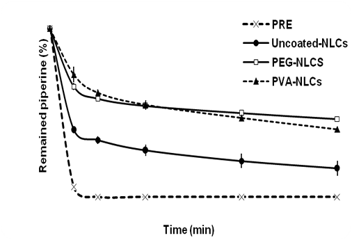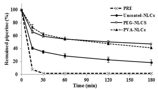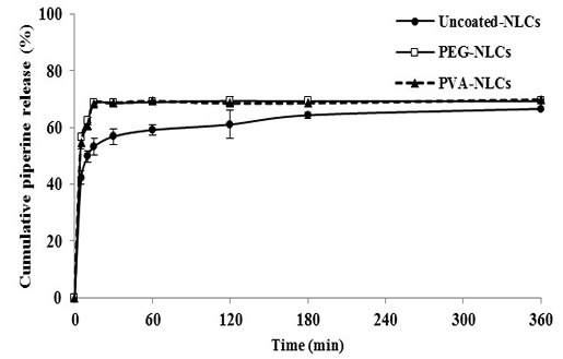 In vitro drug release profile of NLCs was determined as it is crucial for an effective local oral drug delivery system. A similar drug release profile was observed for both uncoated-NLCs and polymer coated-NLCs. All formulations illustrated a rapid burst release in the first 5 min. The high initial burst release of piperine was attributed to most of the piperine located at or nearby the particle surface. This phenomenon may be caused by the preparation process. During the heating process, the water solubility of piperine increased, and piperine, in lipid melted droplets were able to diffuse into the water phase. However, in the cooling process, the water solubility of piperine decreased resulting in a re-partition of piperine back into the lipid phase. At the same time, the molten lipid is solidified, thus, the drug could be accessed only in the liquid outer shell and on the particle surface [21]. Interestingly, after 30 min, only 70% of the piperine was released and remained constant for 360 min. The incomplete drug released may be explained by a slow diffusion of piperine from oil nano compartment into the solid lipid matrix before releasing into the medium. Due to the high amount of MCT, 57% of the total lipid phase, the oil was separated as fine droplets being incorporated into the solid lipid matrix during the cooling process leading to the formation of multiple type NLCs [21].