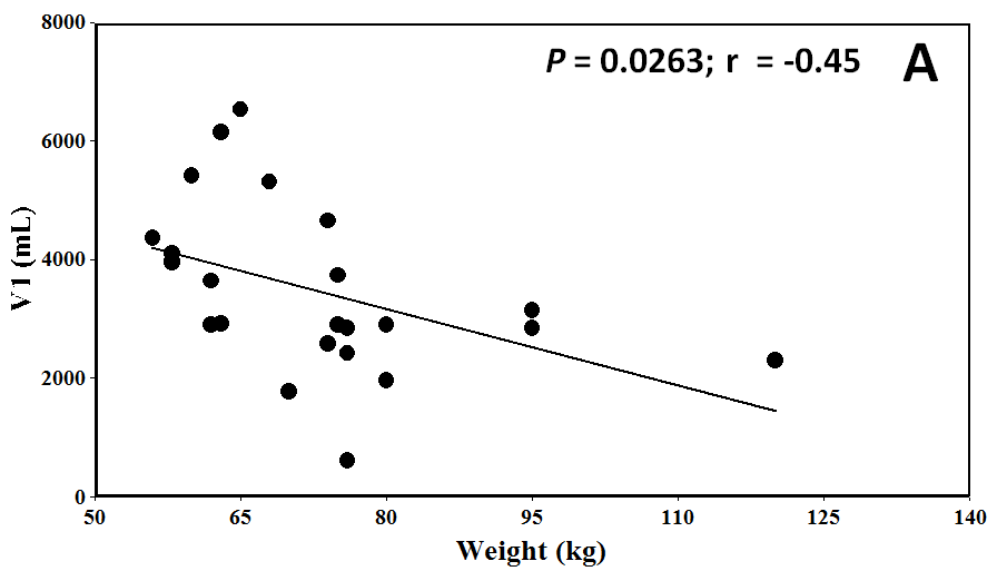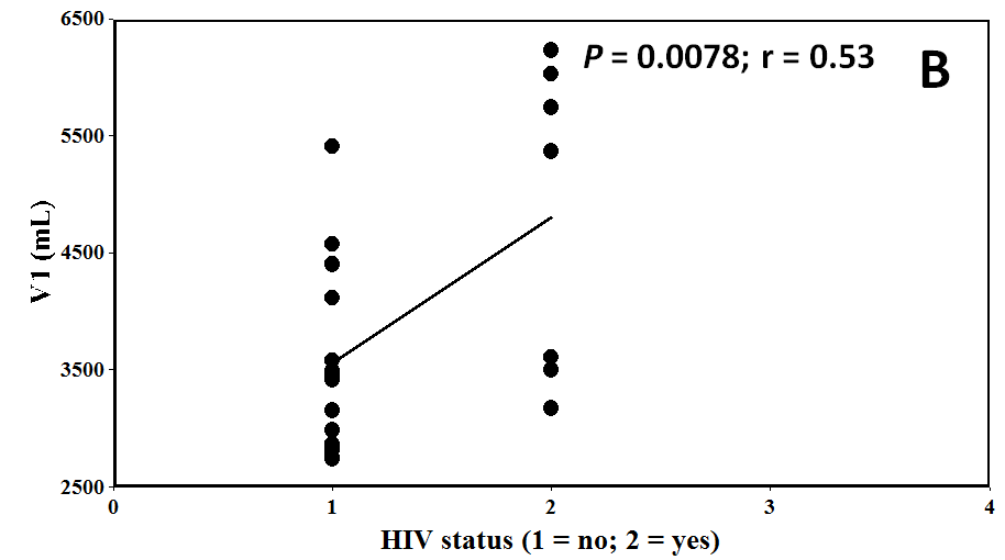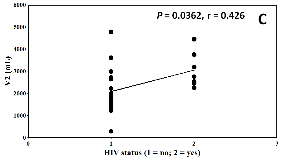 Fig. 1: It shows linear regression analysis between A) central volume of distribution (V1) and patient body weight; B) central volume of distribution (V1) and HIV status; C) peripheral volume of distribution (V2) and HIV status