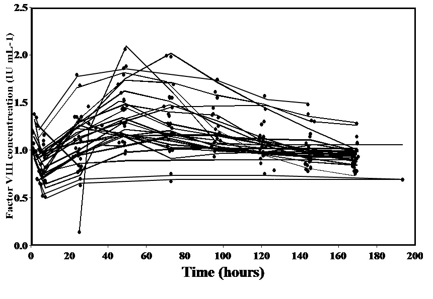 Blood samples were collected in citrate-coated polypropylene tubes immediately before factor VIII injection and at repeated intervals during the infusion (T1, T6, T24, T48, T72, T96, T120, T126, T143 and T198 hours). The number of blood samples per patient ranged from 7 to 10.
