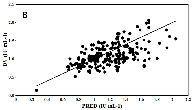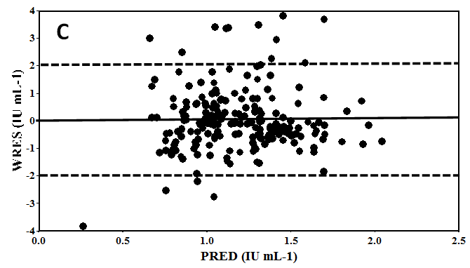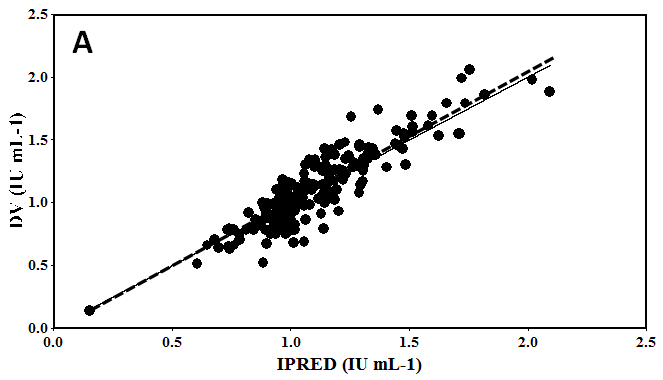 Fig. 3: It shows the goodness-of-fit plots for the final model. (A) Observed concentrations (DV) versus individual model predicted concentrations (IPRED); (B) DVversus model predicted concentrations (PRED); (C) Weighted residuals (WRES) versus PRED. The solid lines in (A) and (B) represent the line of unity and the dotted line in (A) the linear regression line