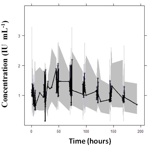 This analysis was performed using PsN [38] and Xpose [39]. The 5th, 50th (population median response) and 95th percentile concentrations were plotted against time and the factor VIII concentrations were superimposed.
