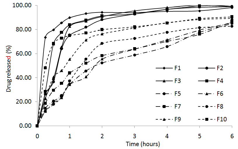 Fig. 1: Drug release of captopril natural-polymers based sustained release tablet