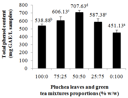 Fig. 1: Total phenolic content of aqueous extract of pluchea leaves and green tea mixtures at various proportions (n=5, Values expressed as mean±SD. Data were analyzed by one way analysis of variance (ANOVA) followed by duncan's multiple range test (DMRT))