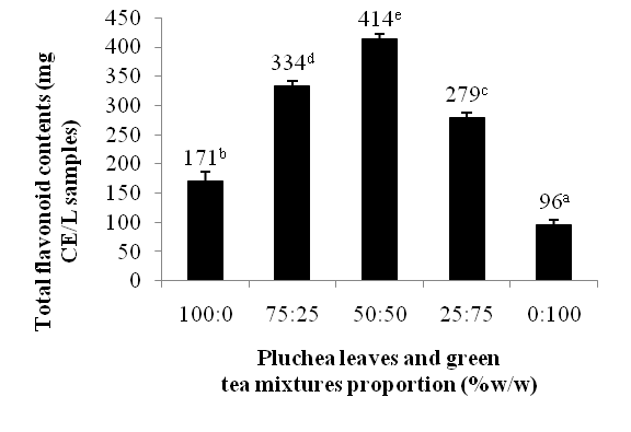 Fig. 2: Total flavonoid content of aqueous extract of pluchea leaves and green tea mixtures at various proportions (n=5, Values expressed as mean±SD. Data were analyzed by one way analysis of variance (ANOVA) followed by duncan's multiple range test (DMRT))