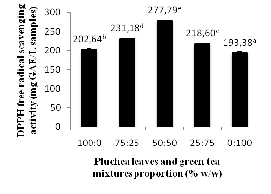 Fig. 3: DPPH free radical scavenging activity of aqueous extract of pluchea leaves and green tea mixtures at various proportions (n=5, Values expressed as mean±SD. Data were analyzed by one way analysis of variance (ANOVA) followed by duncan's multiple range test (DMRT)