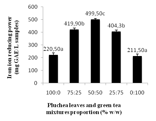 The total antioxidant activities (TAA) determined by reducing power (RP) of aqueous extract of pluchea leaves and green tea mixtures at various proportions were expressed as mg of gallic acid equivalent per L of samples (fig. 4). Among samples evaluated, the 50:50 proportions of pluchea leaves and green tea mixtures had the highest reducing power, this graph pattern of the RP was similar to the graph pattern of DPPH free radical scavenging activity. There was trended that the RP had the same graph pattern as it of TFC.
