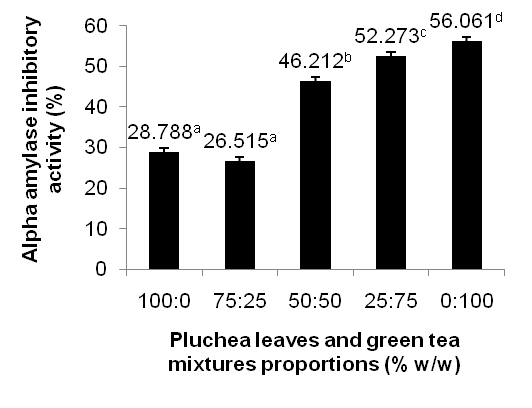 Fig. 5: α-Amylase inhibitory activity of aqueous extract of pluchea leaves and green tea mixtures at various proportions (n=5, Values expressed as mean±SD. Data were analyzed by one way analysis of variance (ANOVA) followed by duncan's multiple range test (DMRT))